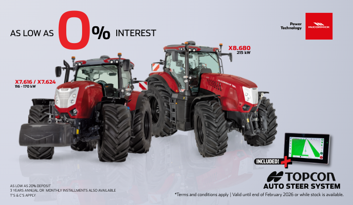 If you’re looking to upgrade your operation with serious power and smarter technology, now is the time. McCormick is bringing precision farming within reach with a limited-time promotion on the X7 and X8 tractor ranges — including a Topcon Auto Steer System at no extra cost and finance options from 0% interest.